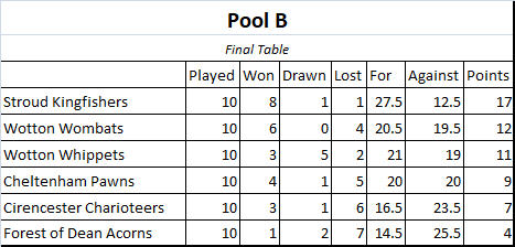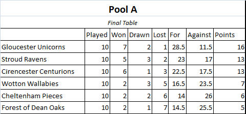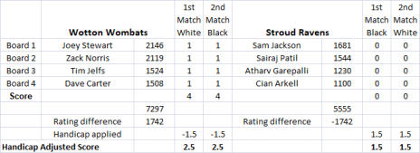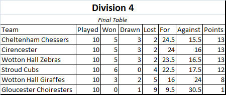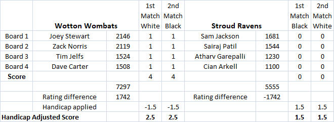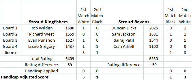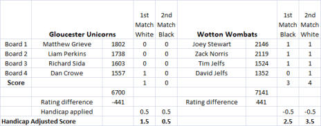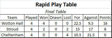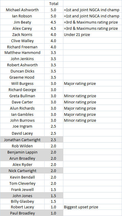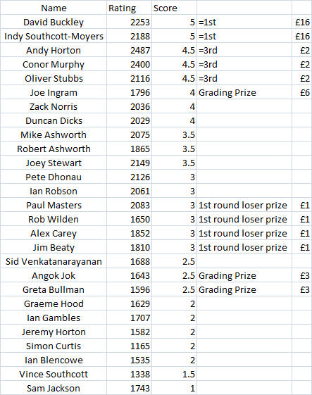 Mike Ashworth 5.5 - First PrizeZack Norris 4.5 - Second PrizeJohn Jenkins 3.5 - Third Prize (on Buchholz Cut 1 tie break)Duncan Dicks 3.5 Sam Jackson 3.5Rob Ashworth 3.5 Graeme Hood 3.5 - under 1800 rating prize (on lowest rating tie break).Benjamin Lappin 3Rob Wilden 2.5Ian Gambles 2Greta Bullman 1Jon Corrick 0.